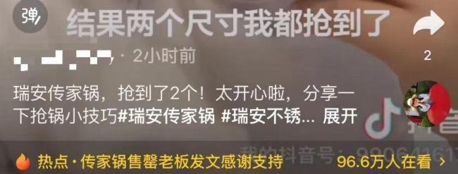 11月25日,在众多网友的催促下,浙江瑞安“传家锅”正式上线。第一批预售的2万口锅吸引了超过10万人预约抢购,上线仅25秒便迅速售罄。相关话题迅速冲上平台热榜,多位网友分享了抢购经历,但也有网友表示根本没抢到。