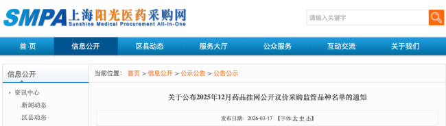 3月17日,上海药事所发布《关于公布2025年12月药品挂网公开议价采购监管品种名单的通知》,公布2025年12月重点监控的品种10个,新申请超“黄线”品种10个,原在库超“黄线”品种10个,未通过公允性品种10个。