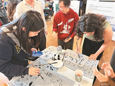 各国学生在中国展位前体验写毛笔字。