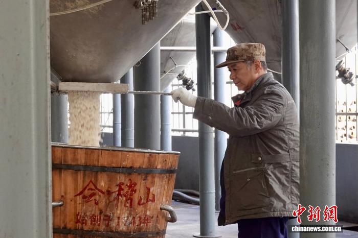 11月21日,酿酒师傅正在进行开耙。中新社记者 刘子琳 摄