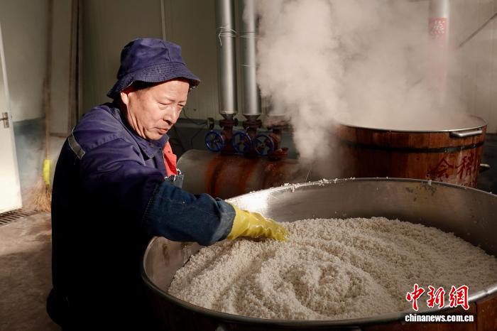 11月21日,酿酒师傅为蒸饭做准备。中新社记者 刘子琳 摄