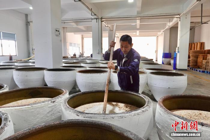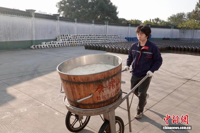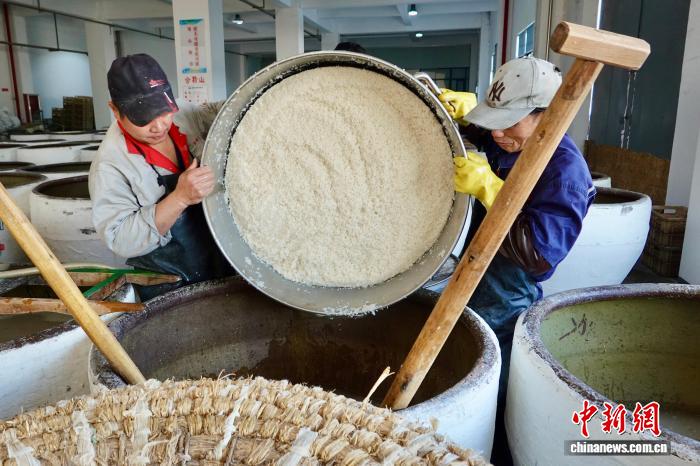 11月21日,正在进行开耙的酒醪。中新社记者 刘子琳 摄