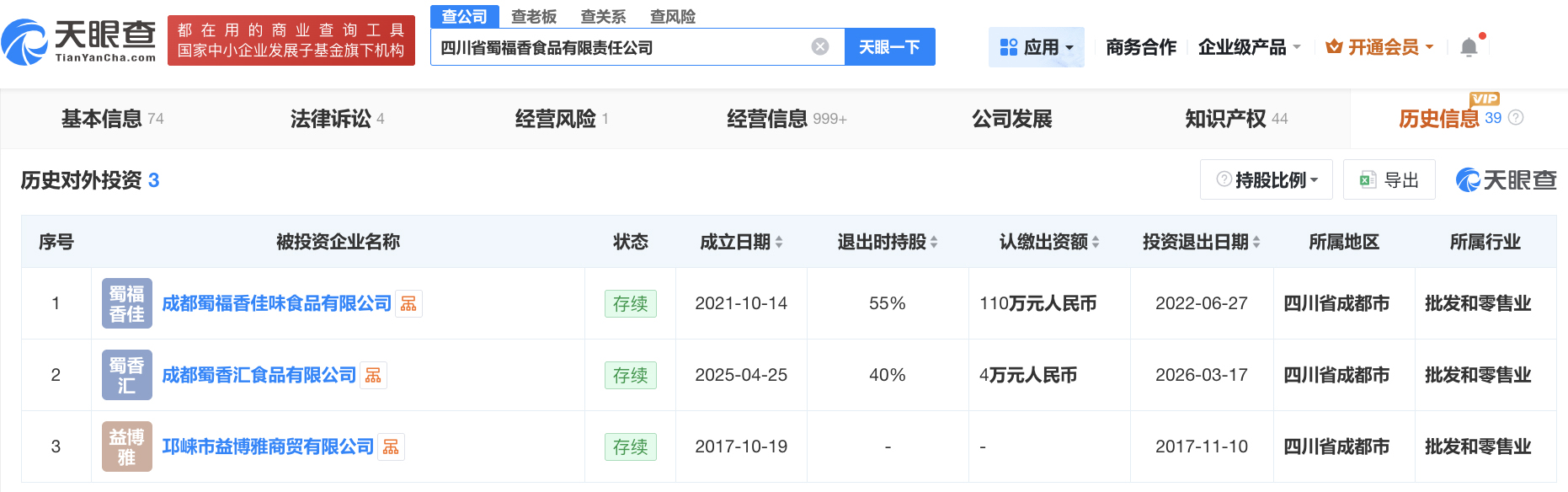国家企业信用信息公示系统显示,3月17日,四川省蜀福香食品有限责任公司退出成都蜀香汇食品有限公司股东行列。天眼查网站显示,四川省蜀福香食品有限责任公司有3条历史对外投资信息,目前已无对外投资公司。